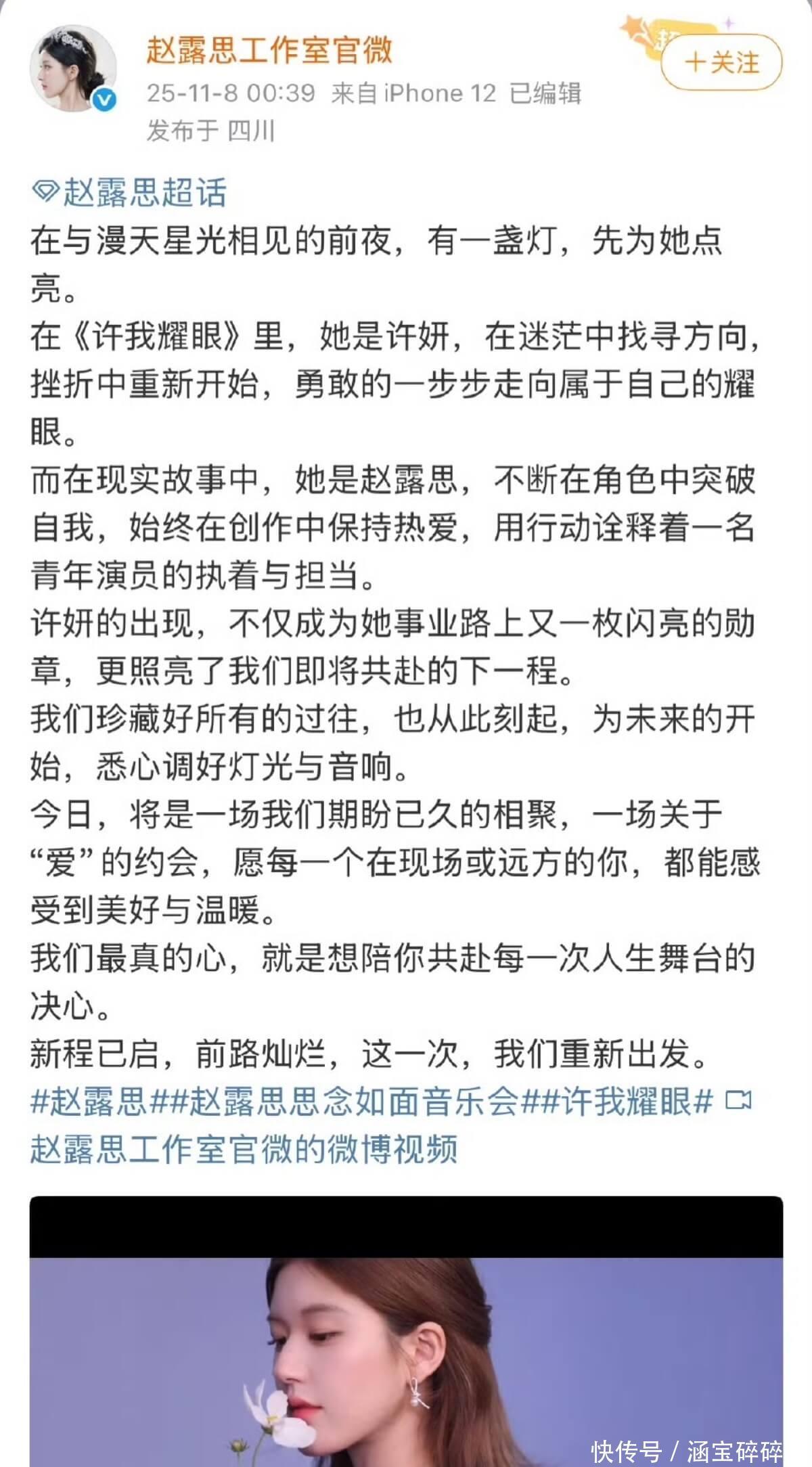8 号这天,已经停更数月的赵露思工作室微博突然更新,宣布新程已启,前路灿烂,这一次,我们重新出发!